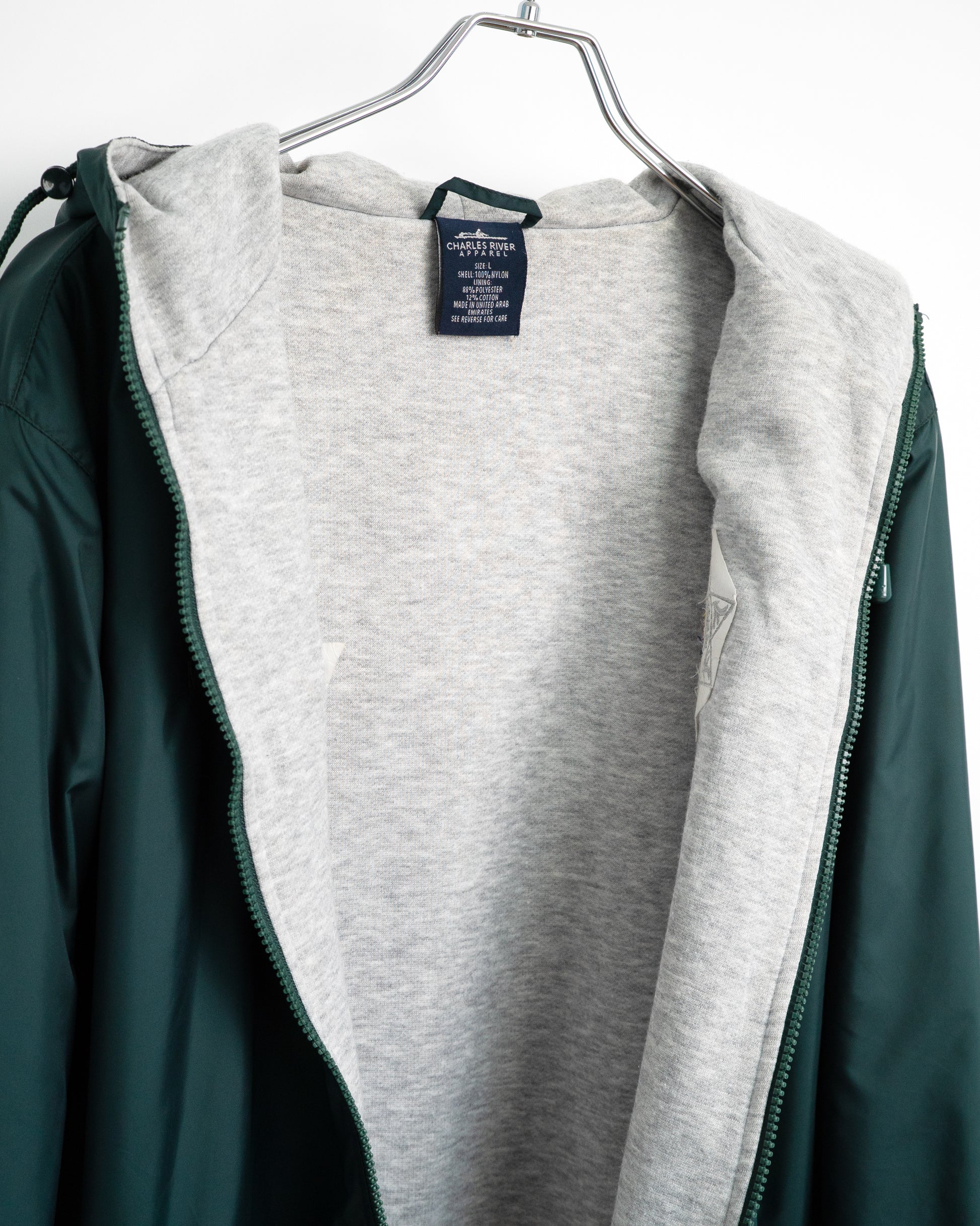 Heather Grey Sweatshirt Lining: Lined with soft, heather grey jersey fabric, providing a visual contrast with the dark green nylon shell.
