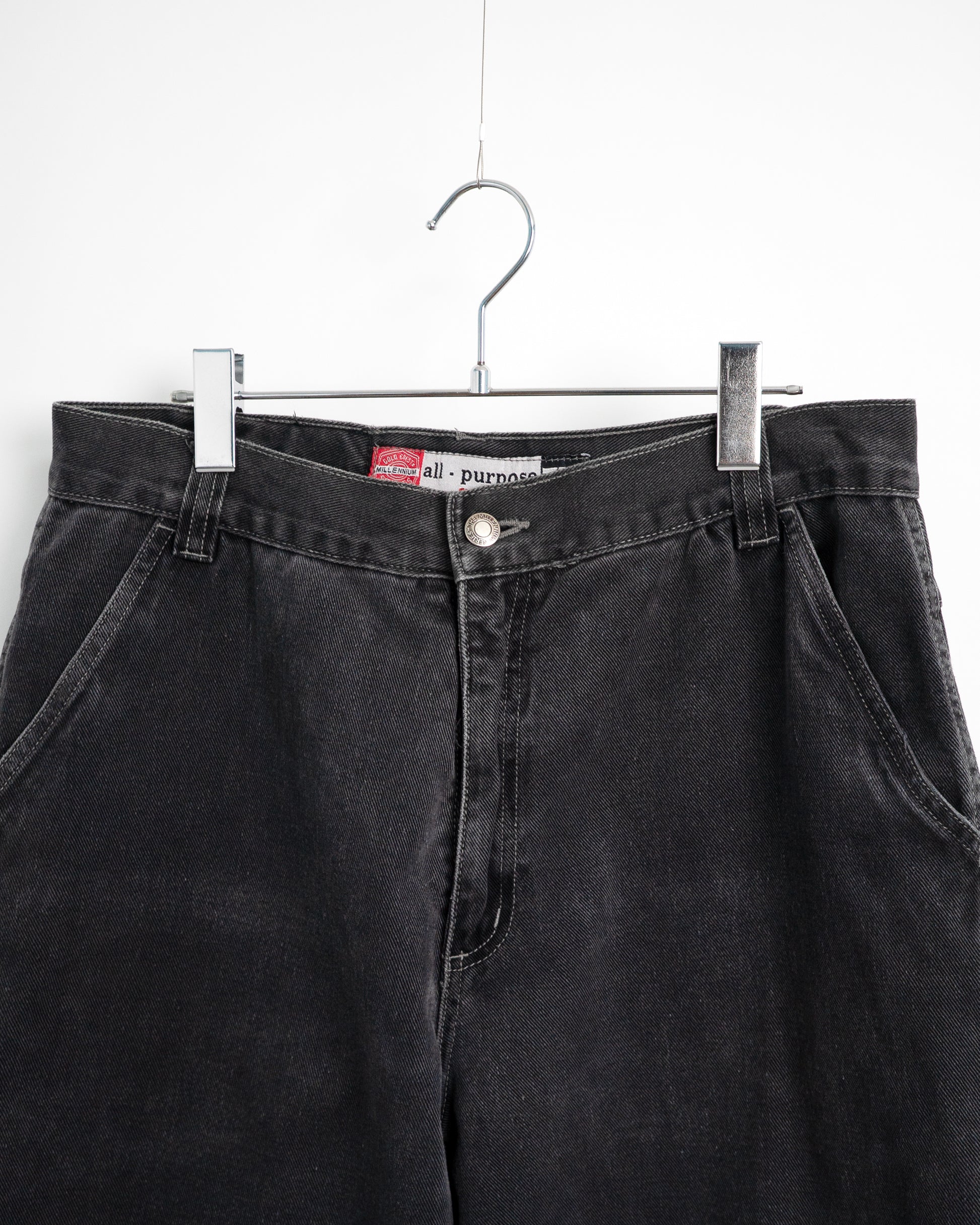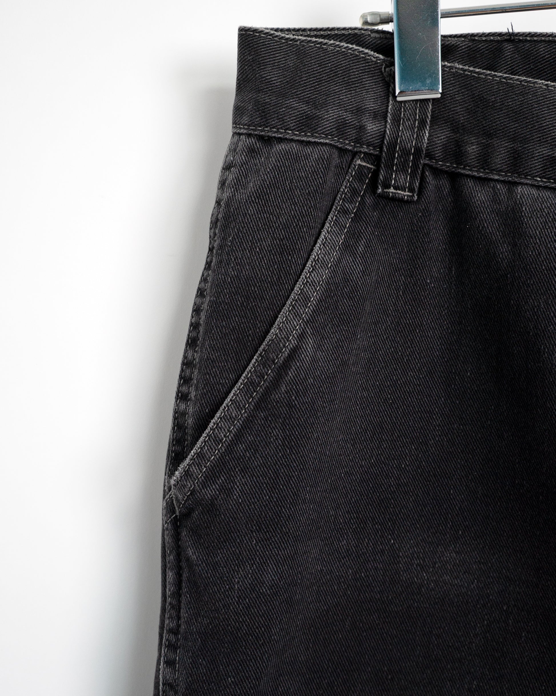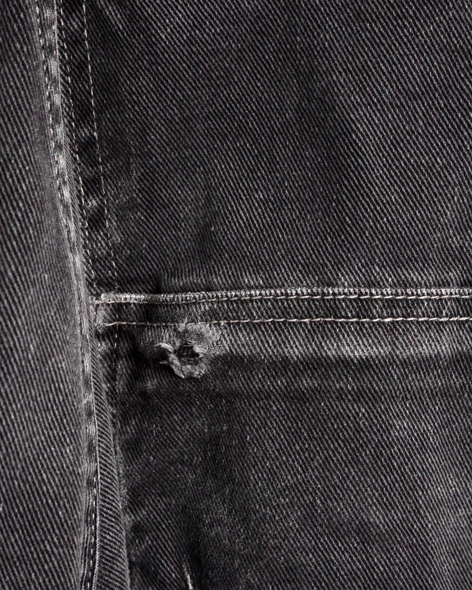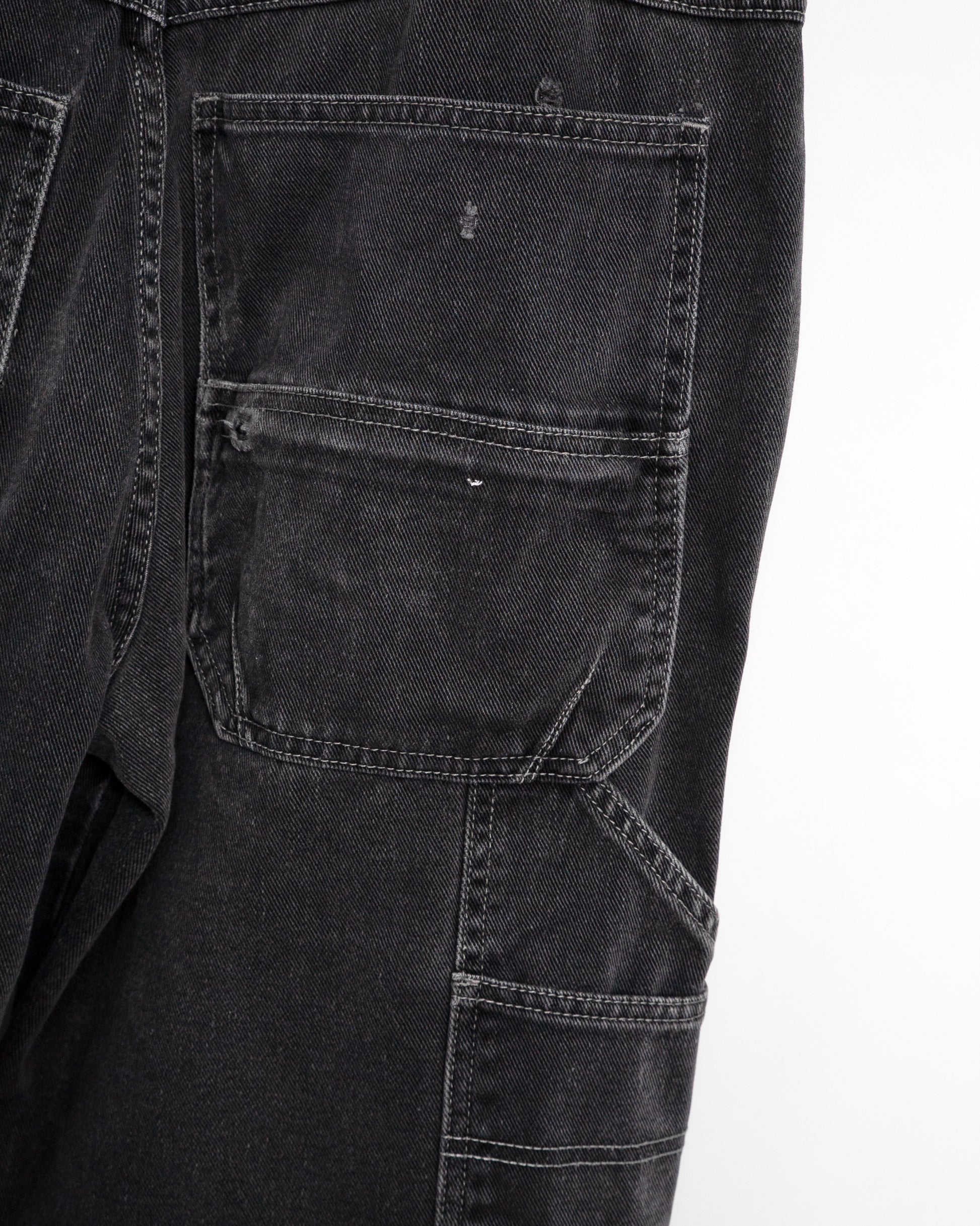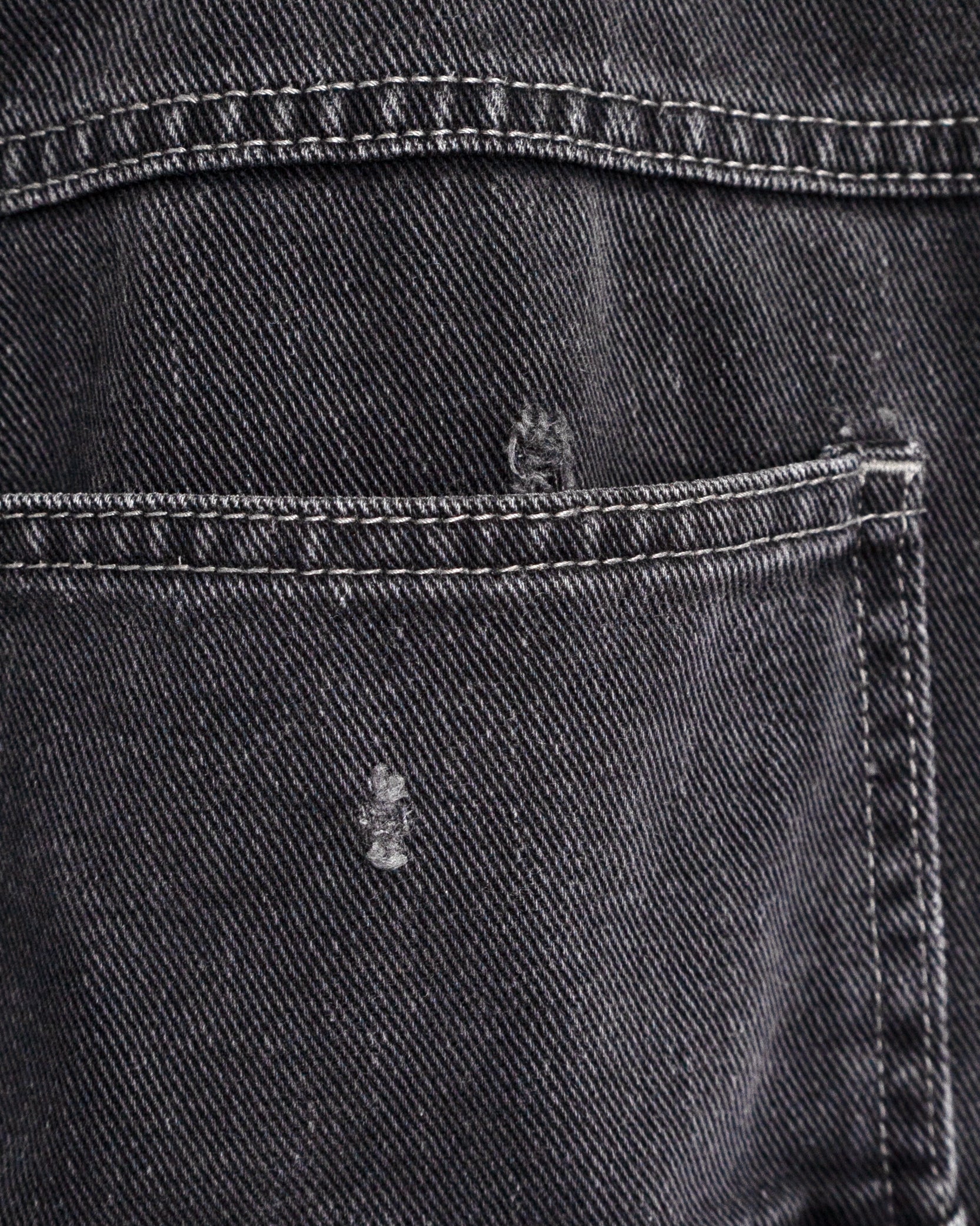 • Material & Origin: 100% cotton black denim. Made in Nicaragua. Shows overall fading and wear on hems and pockets.