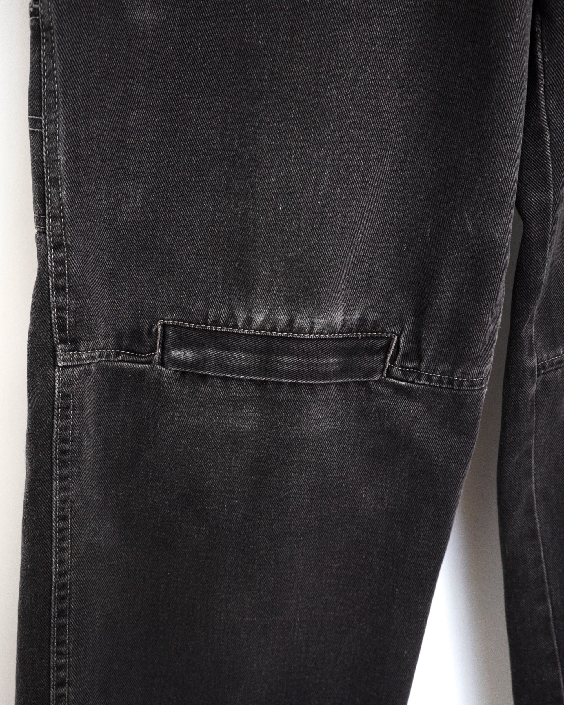 • ブラックデニム: 綿100%の厚手な生地。全体に色落ち、裾やポケット周辺にスレ・ダメージあり。