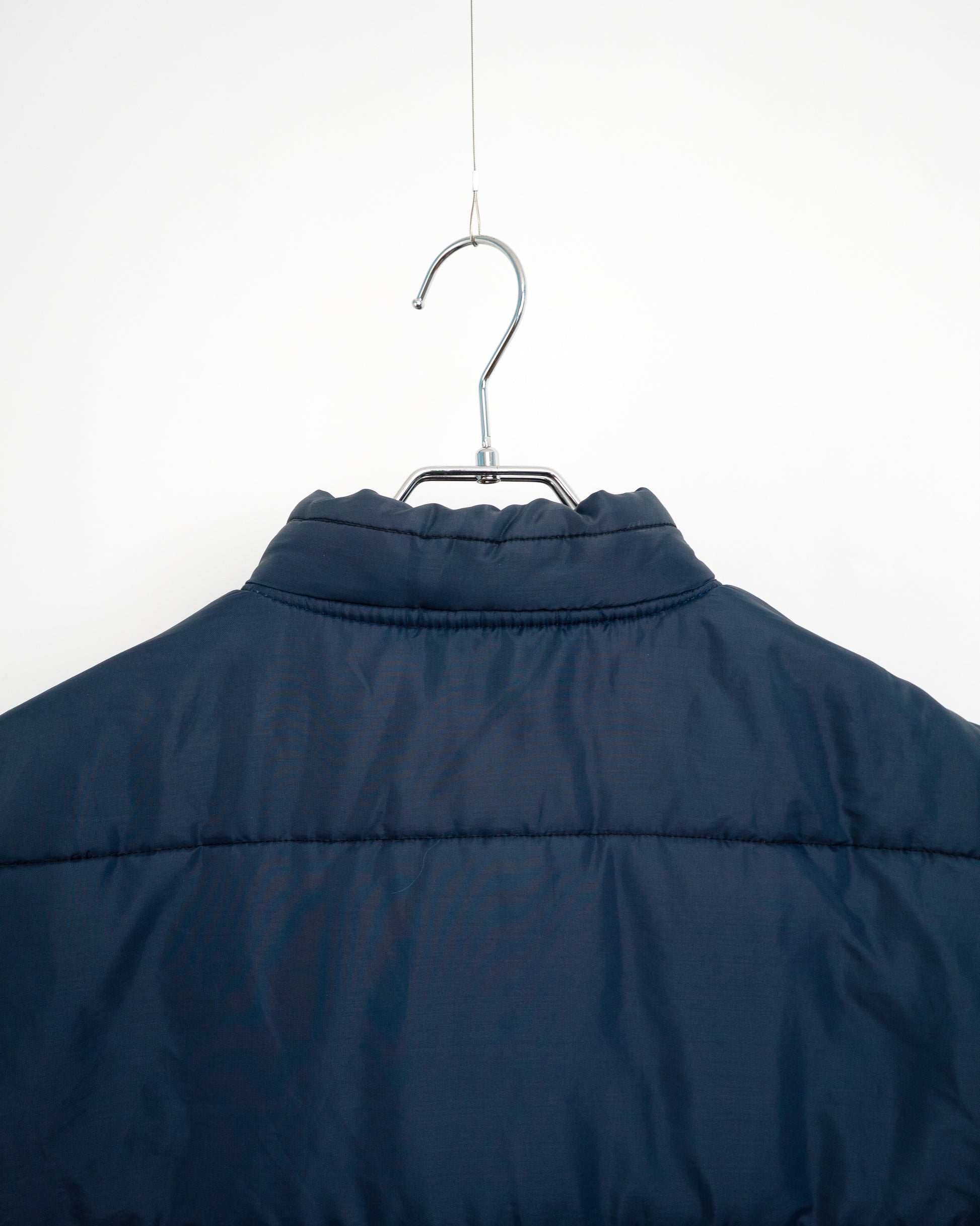 実用的なボーダーキルティング:横段のキルティングにより中綿の偏りを防ぎ、保温性を維持。ネイビーのシェルは汎用性が高く、どんなコーディネートにも馴染みます。