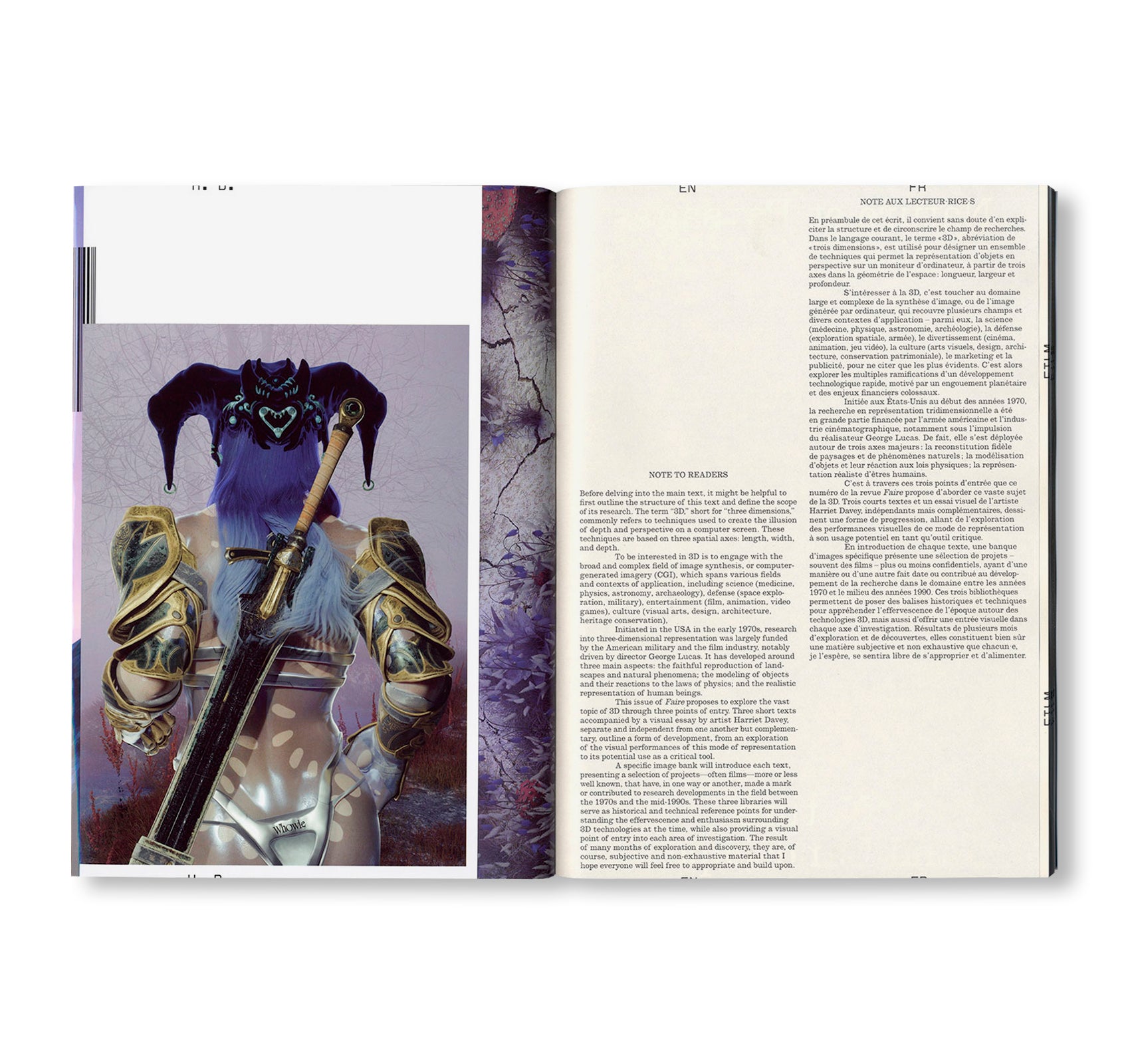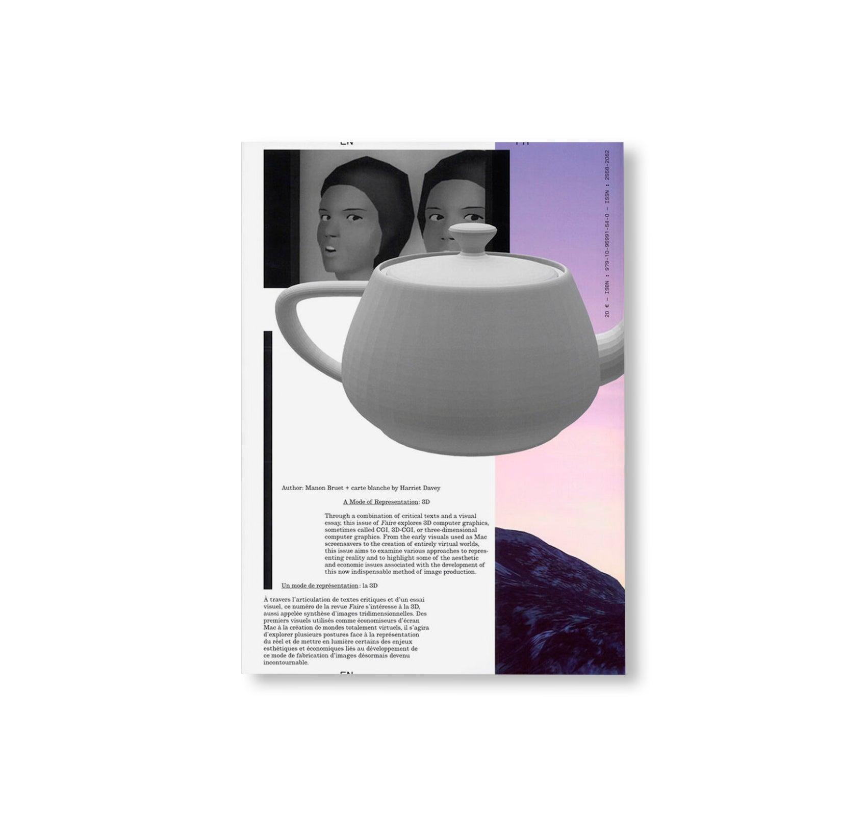 Through a combination of critical texts and a visual essay, this issue of Faire explores 3D computer graphics, sometimes called CGI, 3-D-CGI or three-dimensional computer graphics. From the early visuals used as Mac screensavers to the creation of entirely virtual worlds, this issue aims to examine various approaches to representing reality and to highlight some of the aesthetic and economic issues associated with the development of this now indispensable method of image production.
